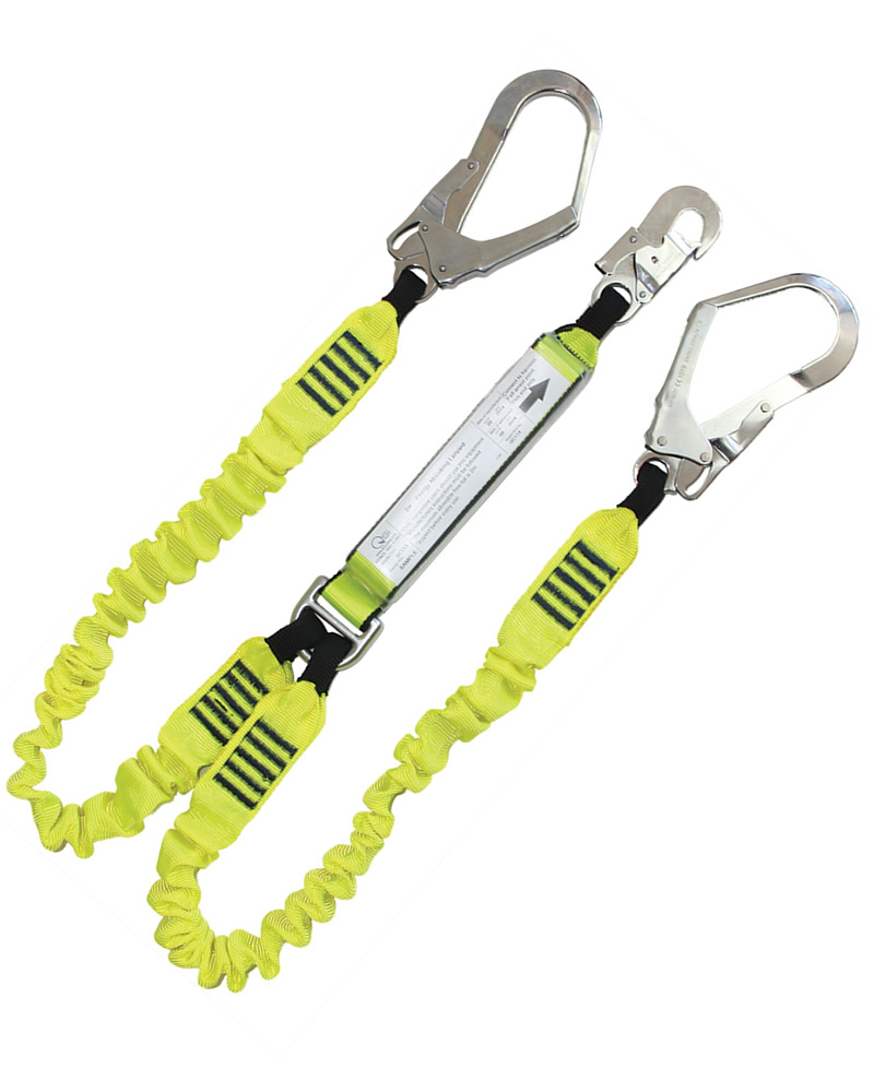2m double leg shock absorbing lanyard with 1 double action hook and 2 STEEL scaffolding hooks.