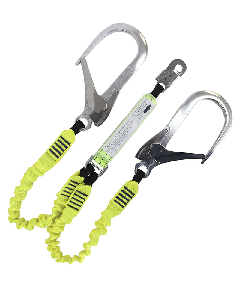 Double leg shock absorbing lanyard with 1 Double Action Hook and 2 Giant Alloy Hooks.
