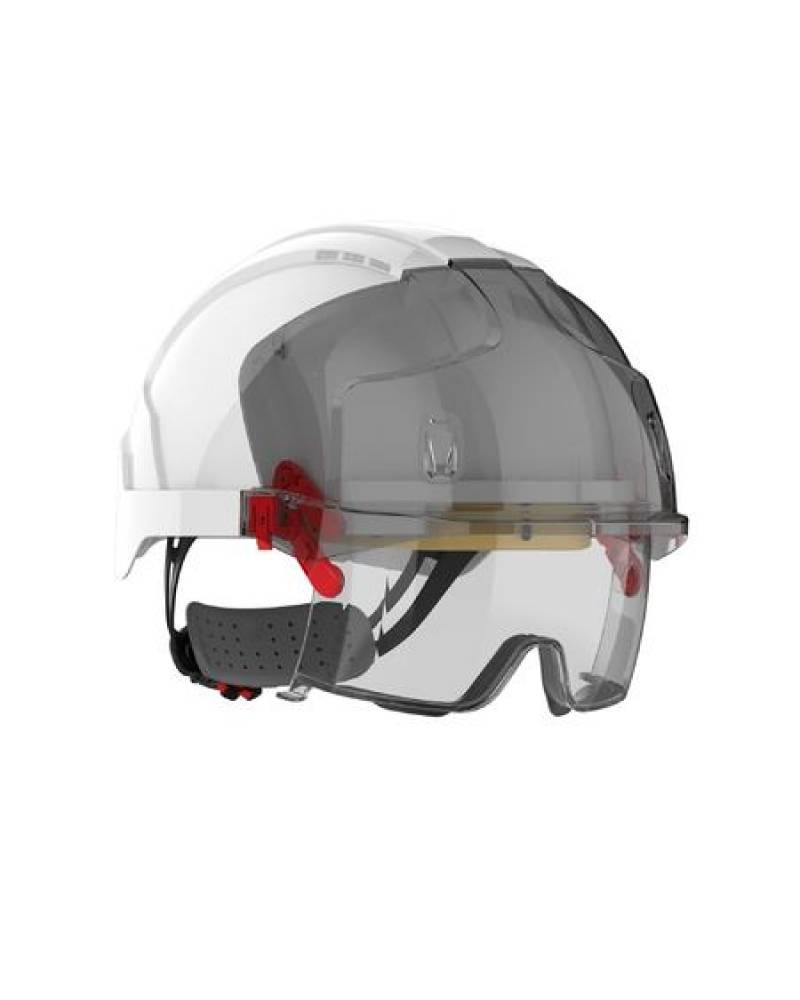 - Eye protection made with optical class 1 material for a panoramic view with minimal distortion. The integrated eyewear offers A-rated impact resistance and UV filtering, with anti-mist and anti-scratch coatings.