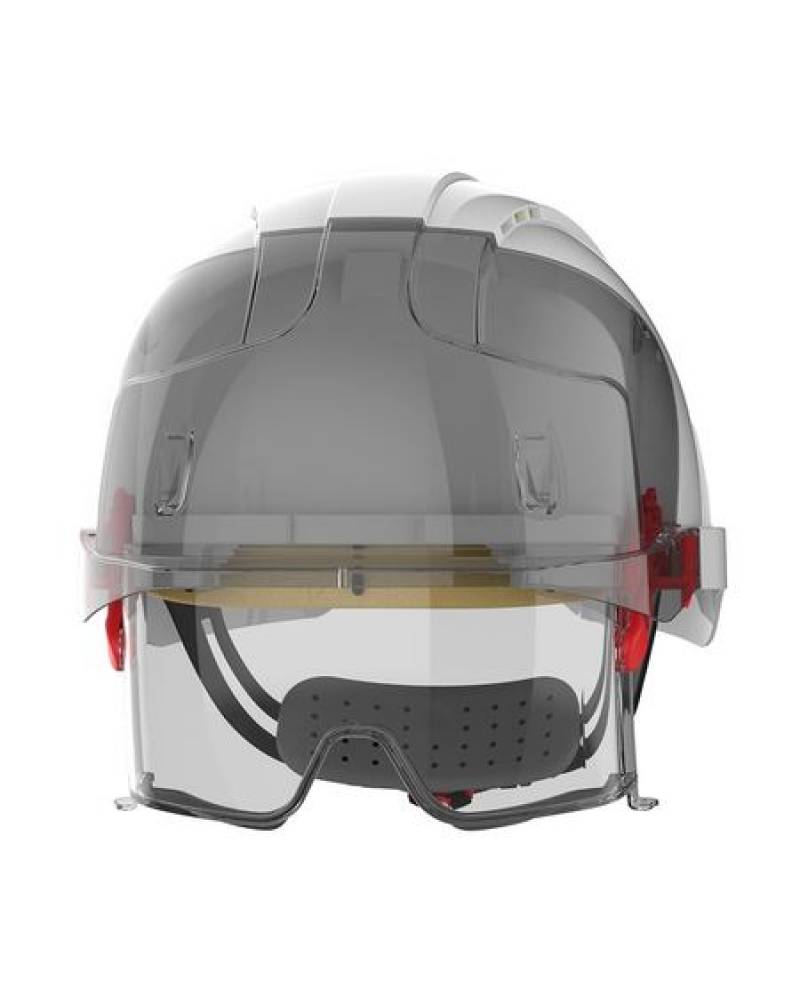 - Eye protection made with optical class 1 material for a panoramic view with minimal distortion. The integrated eyewear offers A-rated impact resistance and UV filtering, with anti-mist and anti-scratch coatings.