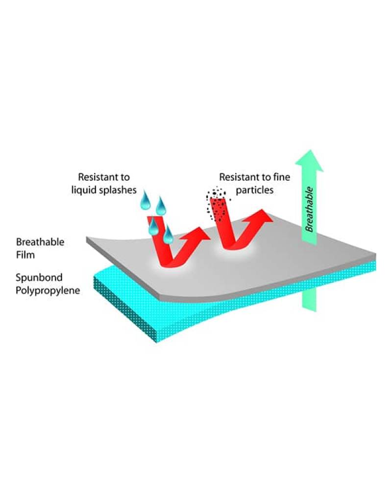 - Made from 60GSM non woven polypropylene with a Microporous laminate film resistant to liquid splashes while remaining breathable.