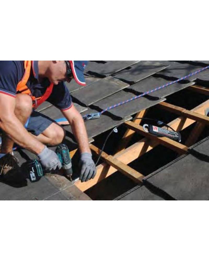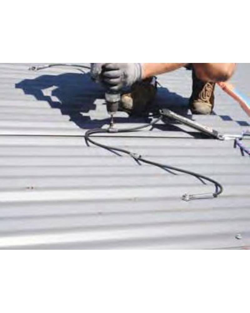 The ultimate, flexible, lightweight anchor ideal for fixing through existing fixing holes in metal sheet roofing. NEW WIRE CABLE DESIGN. Popular with all workers on roofs. Requires 6 fixings as specified in instructions, into solid structure, the cable can be around angles, looped or bunched so long as no fixings are closer than 100mm apart.