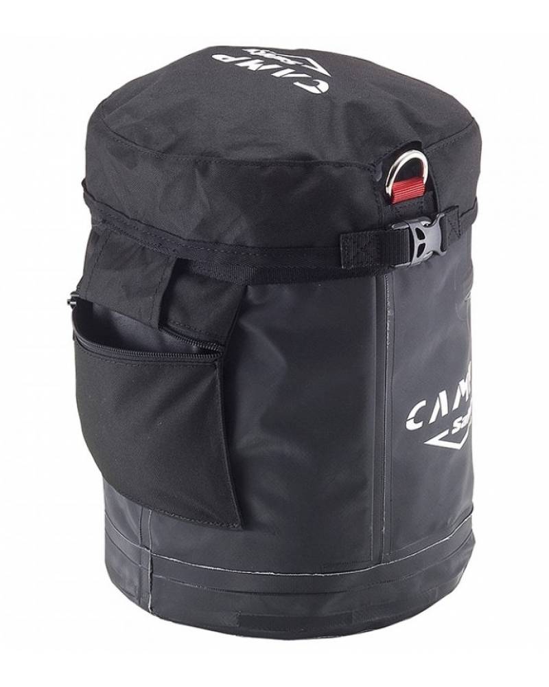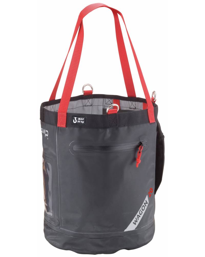 - Three metal rings are designed for clipping to a harness or suspending from a rope or structure. Semi-rigid construction keeps the bucket open during use. Closure hood stows away in a pocket when not in use. Wide interior pockets for extra organization.