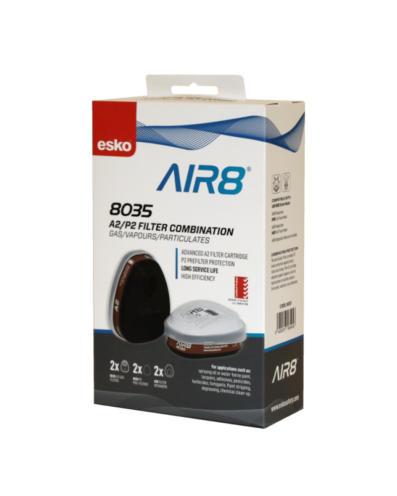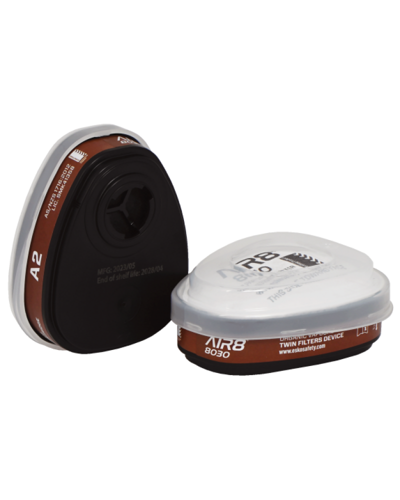 - Contents: 2 x 8030 A2 gas cartridges, 2 x 8010 P2 prefilters, 2 x 810 filter retainers