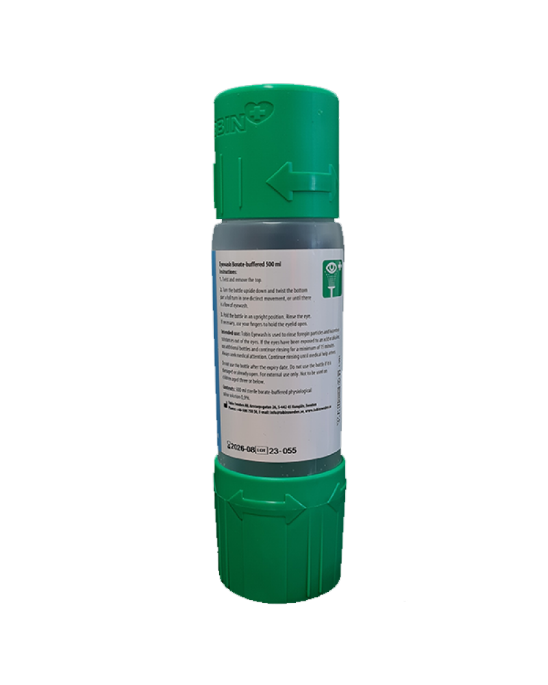 - 1 x 500ml buffer solution (borate-based eyewash), ideal for when space is a problem and/or eyewashes are required in a number of spots in the same area.