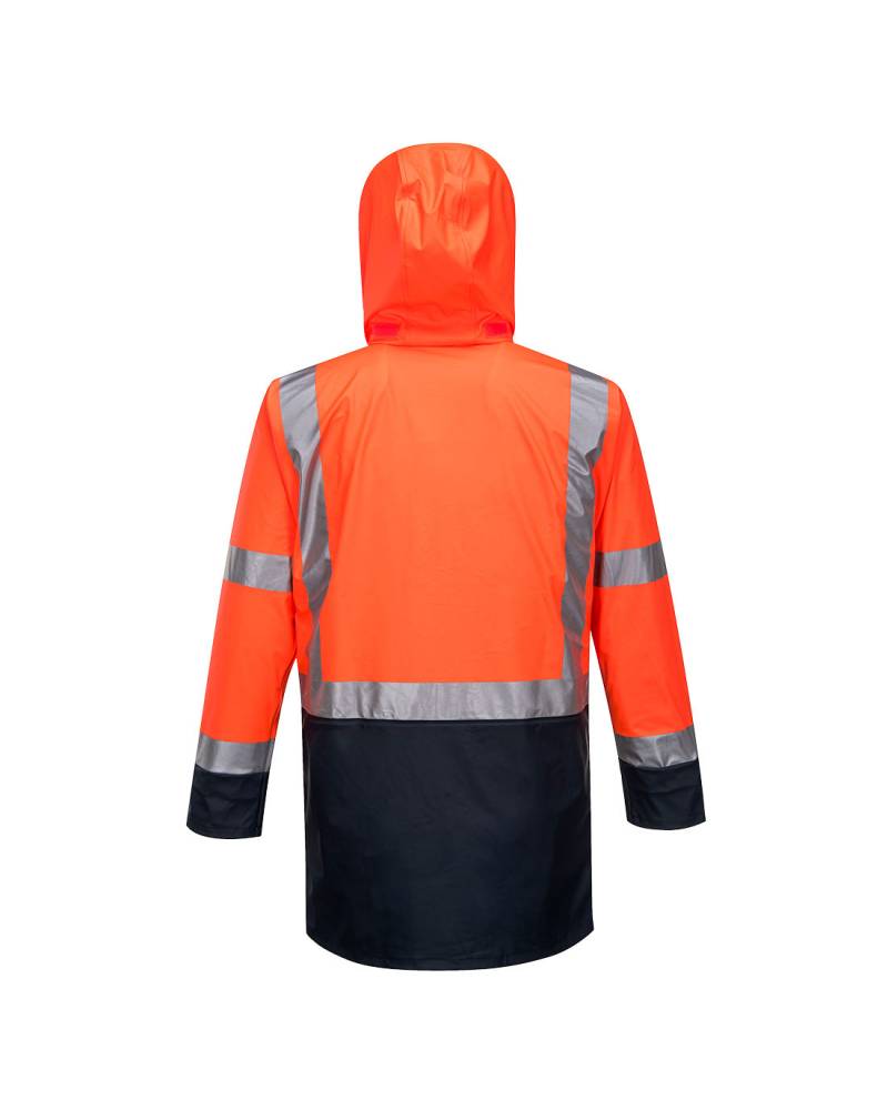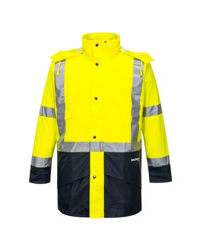 High visibility long line waterproof/breathable BREATHETEC PU jacket with durable knit backing, welded premium reflective tape detail, 4 way stretch, welded seams, large front pockets, adjustable stowaway hood & storm protection collar.