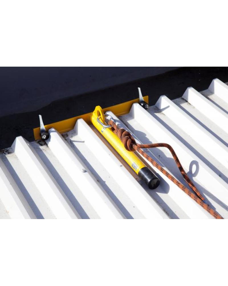- Single person fall arrest/restraint temporary roof anchor for use on a variety of selected metal roof sheeting, ideal for residential, commercial and industrial applications.